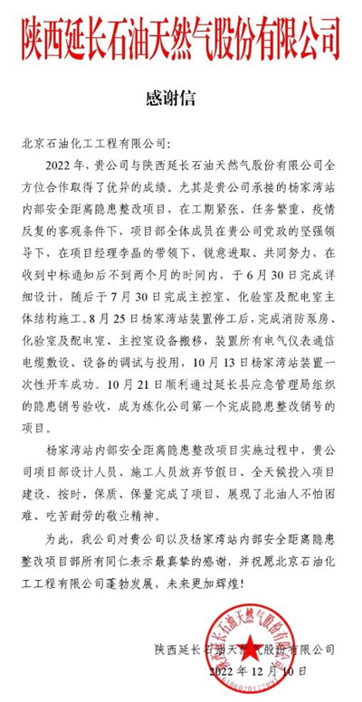 近日,开云网页版收到来自陕西延长石油天然气股份有限公司的感谢信,对我公司总承包的杨家湾站内部安全距离隐患整改项目在建设期间精心策划、合理安排施工、克服不利因素,保质保量按期完成了任务目标,得到了业主的肯定。
