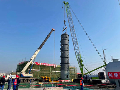 二甲醚反应器为二甲醚工段的核心设备,其将上游来的物料甲醇经二甲醚反应器在催化剂作用下脱水制成二甲醚,为装置主工艺的起点,亦为下游羰基化工段提供关键反应物料。二甲醚反应器总重约90吨,主吊使用260吨履带吊,300吨汽车吊溜尾,经过1小时吊装,设备平整就位。