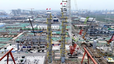 据悉,两台乙醇脱氢塔为项目首次进行超百吨以上设备吊装。吊装前,项目组在大件吊装专家论证、吊具调度、施工环节有序衔接、过程质量把控、安全操作及监控等环节进行了有效策划及充分准备,确保了设备顺利吊装,并为后续三台组装塔器的顺利吊装积累了宝贵的经验。(通讯员/黄耀辉 摄/王超)