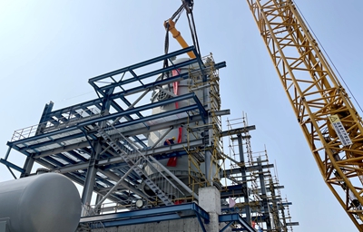 乙酸甲酯加氢反应器总重460吨,最大直径5.9米,设备于临近项目的制造厂完成整体制造后,采用模块车运输至现场。设备吊装主吊采用1250吨履带吊,400吨履带吊溜尾。设备于10时38分起吊,历时三小时顺利就位于框架基础上。