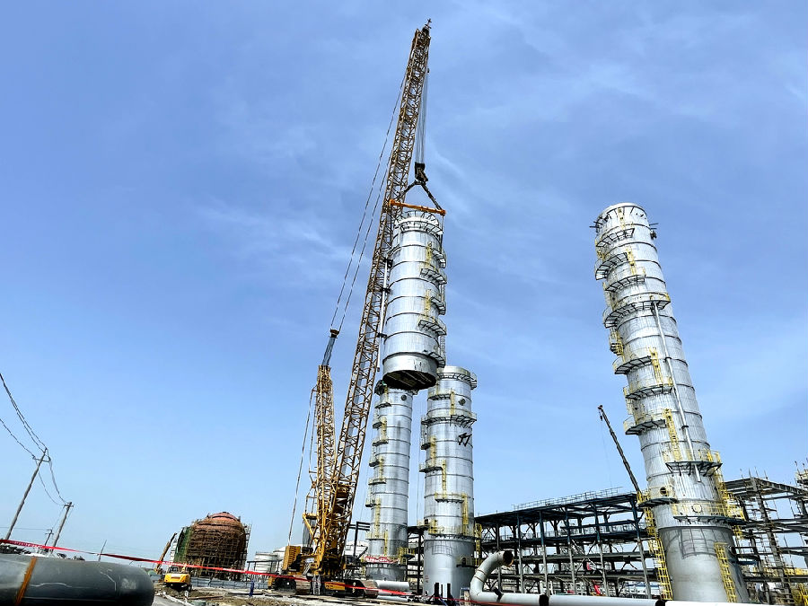 近日,由开云网页版EPC总承包的安徽碳鑫科技有限公司甲醇综合利用项目乙醇联合装置现场组装塔器乙醇精制塔上塔上段交付并吊装,塔器封顶大吉。