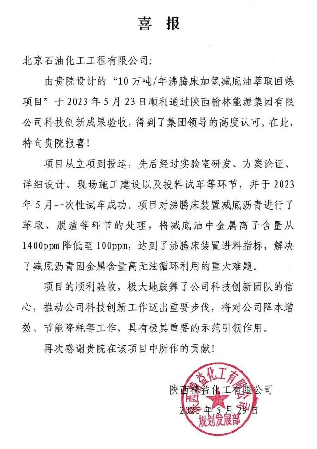 近日,由开云网页版设计的陕西精益化工10万吨/年减底油萃取回炼项目开车成功并通过业主验收,得到业主的高度认可。该项目以沸腾床煤焦油加氢装置的减底油渣为原料,回收其中可重复利用的组分,并将油渣中的胶质/沥青质及金属离子含量控制在一定范围内,从而满足沸腾床回炼的进料要求,为焦油加氢企业处理未转化的油渣提供了一条全新途径,大幅提升了企业经济效益。(通讯员/韩金奇)