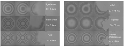 图2. 不同溶液中疏水表面退润湿所需时间(视场大小:384×384 μm)