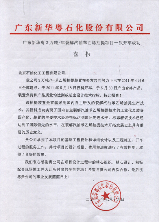 由我公司负责设计的广东新华粤3万吨/年裂解汽油苯乙烯抽提项目于2011年5月18日投料开车,并于5月30日产出合格产品。目前,装置负荷和产品质量均达到或超过设计技术指标。为此,业主单位广东新华粤石化股份有限公司特向我公司发来喜报。